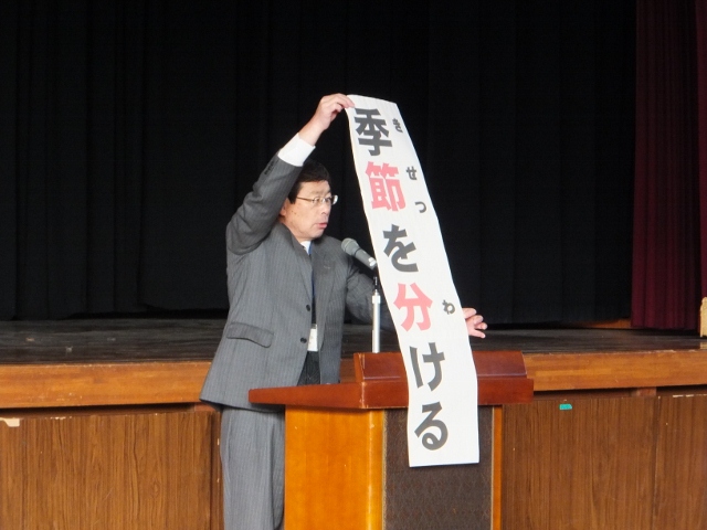 「春」が始まる前日、新しい一年が始まる前日に、「これから始まる、新しい一年が、不幸や災いが無い一年になりますように」との願いを込めて、「豆まき」をするのです。校長先生のお話を聞き、皆、よい勉強をしました。