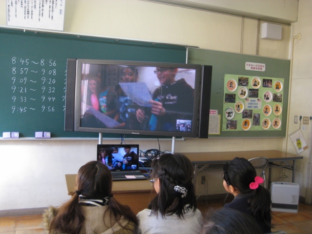 【マロニー小とのSkype交流】 1月24日(土)に、昨年度来日されたマロニー小学校の皆さんとインターネットを利用したテレビ電話で交信をしました。ホームステイを受け入れたり、歓迎会の企画・運営をがんばったりした子たちを中心にたくさんの子どもたちが参加してくれ、短い時間ではありますが、楽しいひとときを過ごし、ふれあいを深めました。この日は、参加してくれた子たちが、その様子を全校の皆に熱く語ってくれました。「言葉や文化の違っても、こんなにもわかり合える!」ということを語ってくれた感想がとても心に響きました。