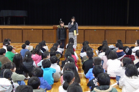 卒業式を前にして、一足先に6年生の修了式を行いました。代表児童が修了証を受け取り、修了式が無事済んだところで、養護教諭から成長の記録のプレゼントがありました。成長の記録カードは、身長が6年間で伸びた分と同じ長さのリボンが結んであり、ほどいてみると、予想以上の長さでびっくり!大きくなったんだね。
