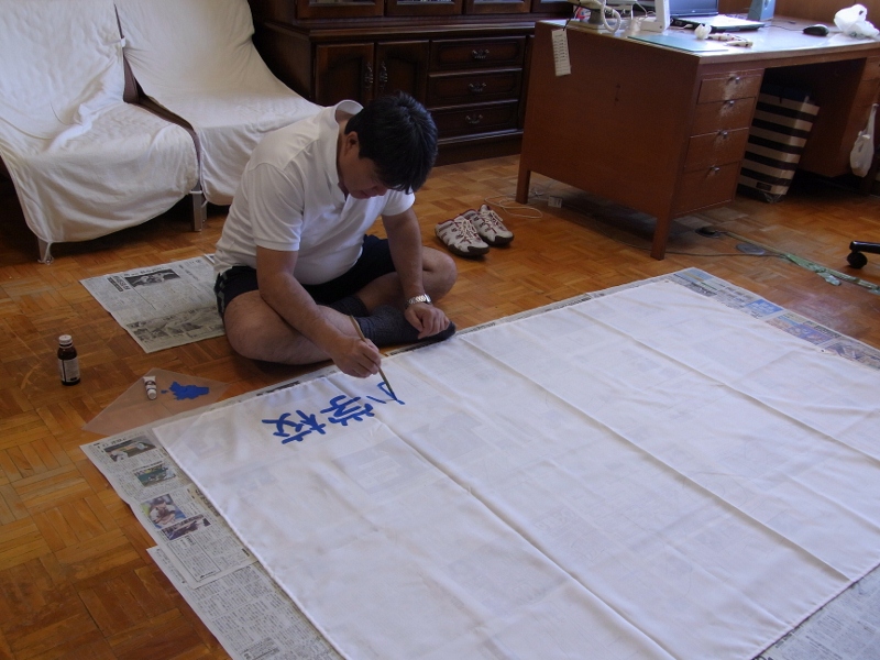 陸上応援旗作成中 ~校長先生が心を込めて~