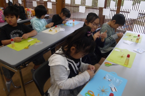 体験学習では、機織り、竹細工、藍染め、風車作りを行いました。