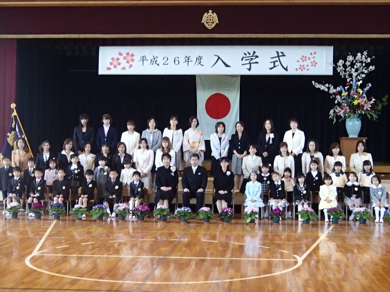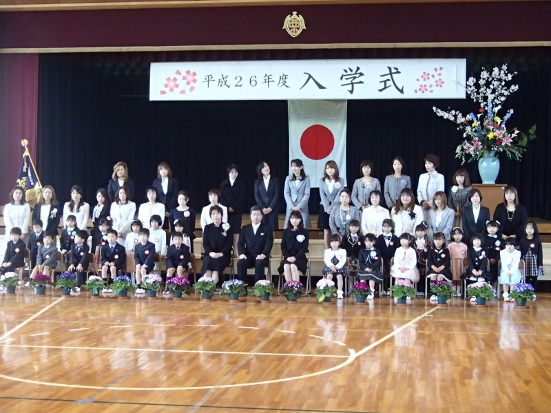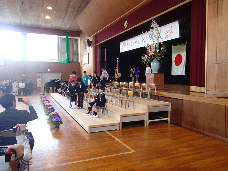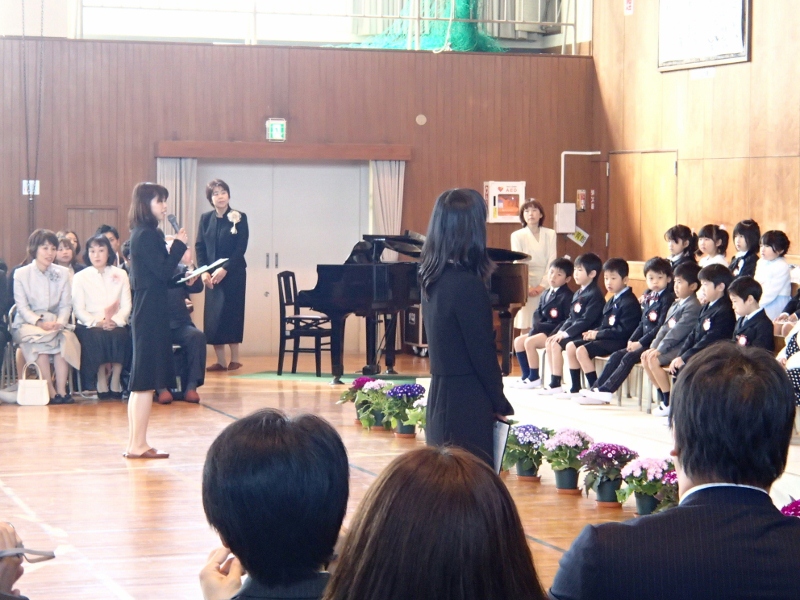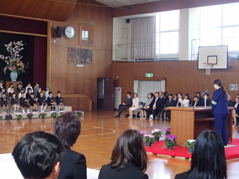 今年度より、本校自慢の『ひな壇』を使って、在校生と対面形式で行いました。新1年生は、新6年生に手をひかれ、少し緊張した表情で入場してきました。しかし、式の中で、担任の先生から、一人ずつ名前を呼ばれた時には、皆、元気に返事をして、その場に立ってくれました。たくさんの保護者の方々、来賓の方々に見守られながら、無事、入学式を終えることができました。