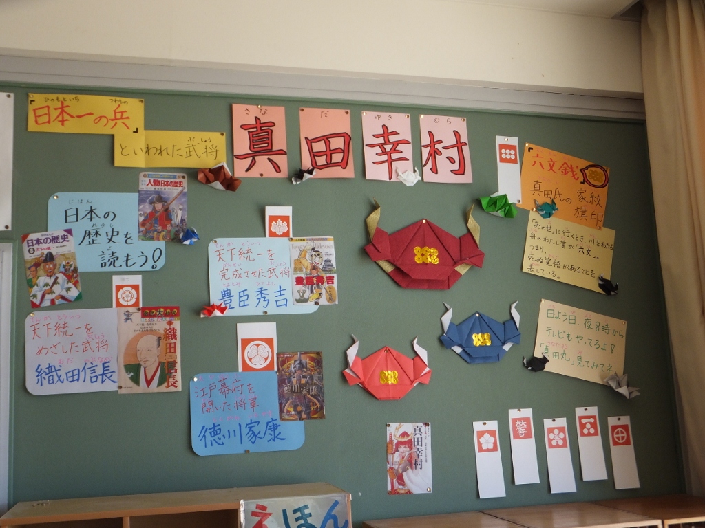 学校の図書室の壁面掲示物も一新しました!今回のテーマは「真田幸村」です。皆、歴史好きになってね!