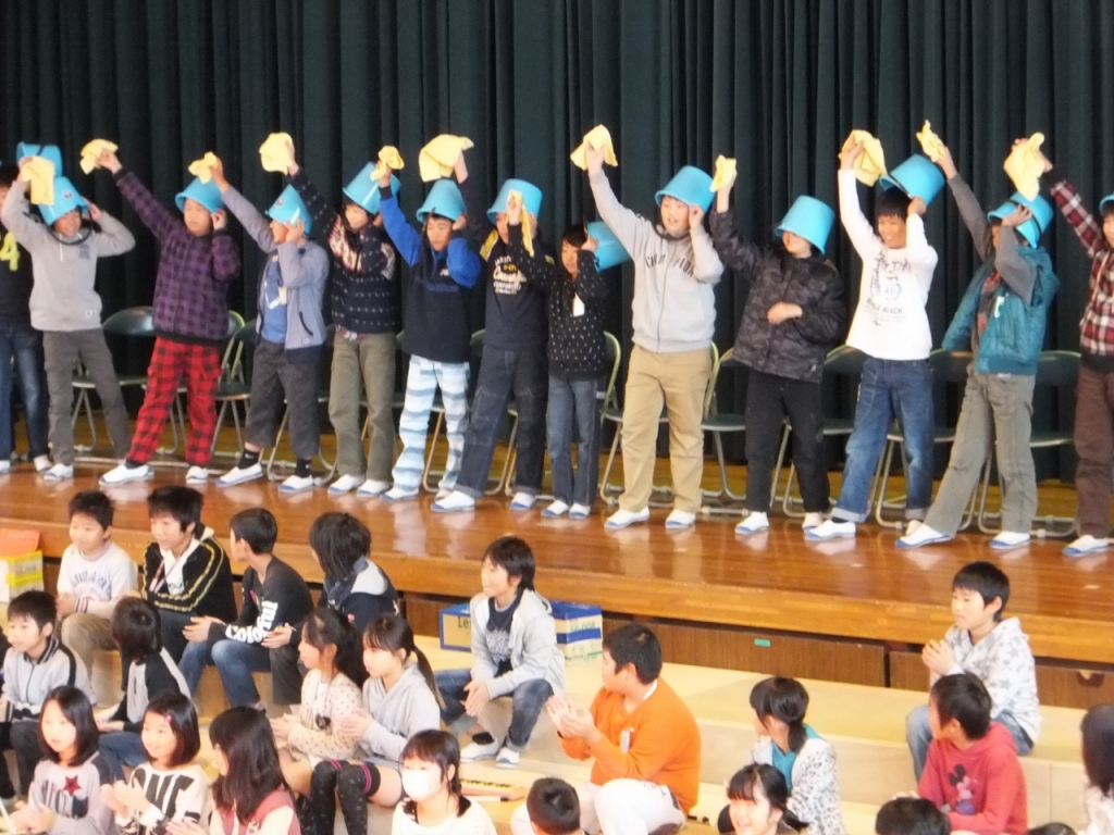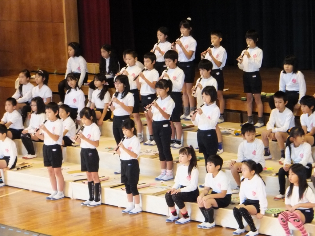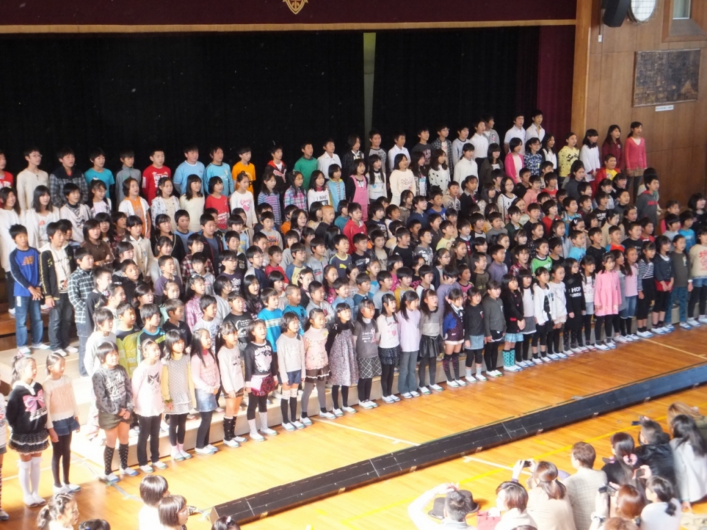 舞台の前に設置したひな壇を生かした「全校合唱」では、全校児童348名が迫力のある合唱を披露してくれ、会場から大きな拍手をいただきました。