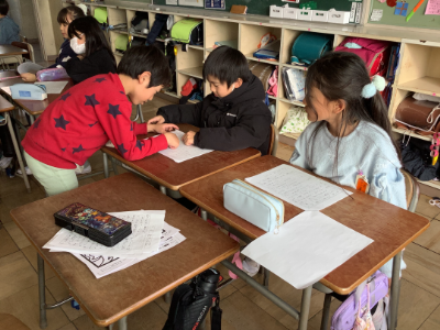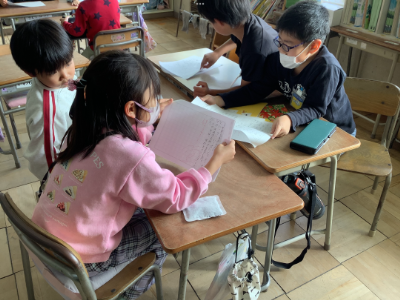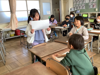 国語科「お話のさくしゃになろう」では、登場人物の設定を決めたり、はじめ、中、おわりの「中」の部分を考えたりして、自分だけのお話を考えました。完成したお話は、クラスの子に発表しました。みんな、友達が考えた話を聞いて楽しんでいました。