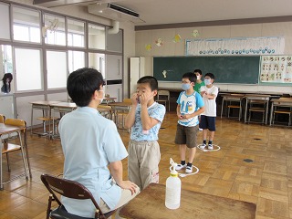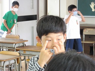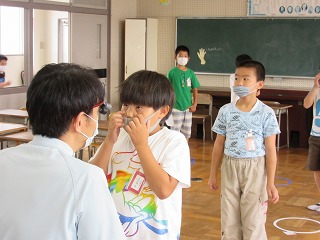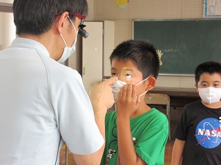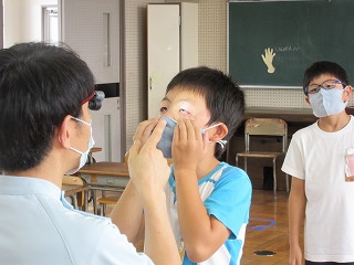 全校のみんなが、眼科医の先生に見てもらいました。1年生のみなさんには、上のような眼位(斜視等)の検査も行われます。