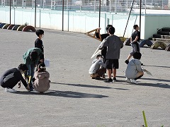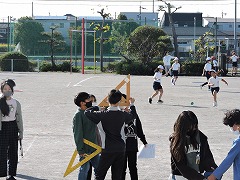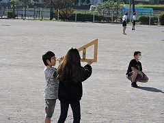 先日6年生が外で何人かずつのグループにわかれ、顔の前に大きな三角定規を当てて何かを覗いています。反対側には、長い巻き尺を持って長さを測っている子がいます。
