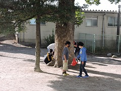 実は、学校のシンボルでもある大きな楠(くすのき)の高さを測っているのです。もちろん直接ははかれないので代わりの方法をとっています。それが算数の学習と言うわけです。