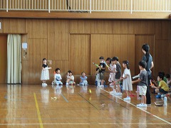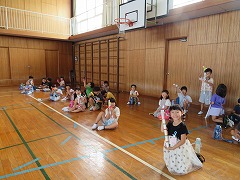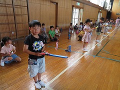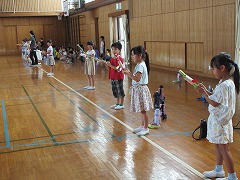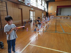 1年生が体育館でロケット飛ばしをしていました。夏休みの日誌の課題としてトイレットペーパーの芯で作ったロケットです。長い棒に差し込んで、輪ゴムの力で飛ばします。横に並んでみんなで一斉に飛ばしました。