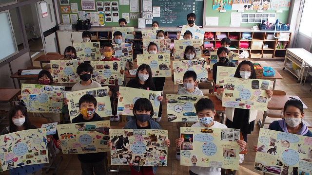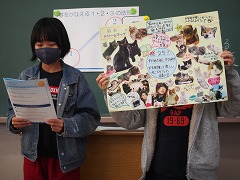 雑誌の切り抜きやプリント、わかりやすい絵などを画用紙に貼ってプレゼンの資料を作り、クラスのみんなの前で発表しました。中には、ちょうどいい絵が見つからなくて自分で描いてきた子もいました。