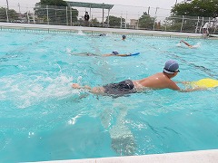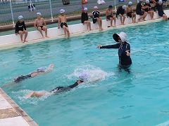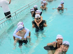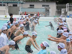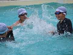 最初に1年生と6年生が入り、一緒に水を掛け合ったり6年生が1年生をおんぶしてプールの中を歩いたりと交流しました。