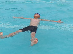 昨日は先週から延期されていたプール開きをやっと行うことができました。暑くも寒くもない気温でしたが、水温の方が3度くらい低いので、みんな「冷たーい」と叫んでいました。