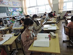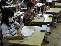 3年生が国語で「ちいちゃんのかげおくり」を読んで、登場人物について読み取っていました。物語文は、登場人物や背景、状況、発言、伝聞、比喩などいろいろな要素が含まれており、慣れていないと勘違いしてしまうことがあります。一つ一つ整理して何が書いてあるのか順番に確認します。