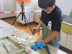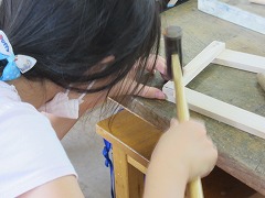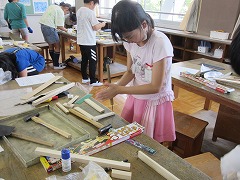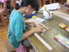 4年生が図工で木工作品を作っていました。いろいろな大きさ、長さ、厚さの木に長さを測って印をつけ、のこぎりで切って錐で穴を開け、釘を打ち付けて組み立てます。最近DIYブームが来ていると言われますが、なかなか子どもたちがのこぎりできたり釘を打ったりするチャンスは少ないでしょう。みんなとても苦労しながらも楽しんで作業をしていました。