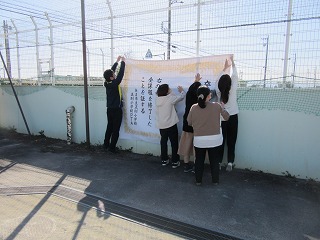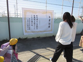 PTAのみなさんが作ってくれた特大の賞状が運動場に飾られ、花を添えてくれました。