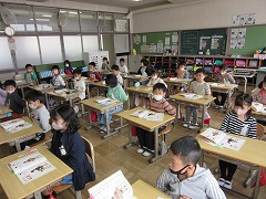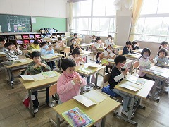 2年生が国語で書写の学習をしていました。よい字を書くために、体をほぐしてから始めます。そして、よい姿勢になることも重要です。