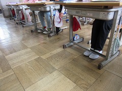 足を投げ出したりせず、足の裏を床にぴったんとつけて体を支えます。背筋をピンとのばして、机とおなかの間や背中といすの背もたれの間ににぎりこぶし1つ分間を開けて真っ直ぐ机に向かいます。