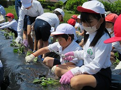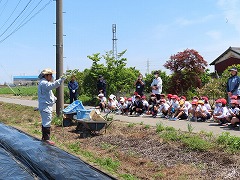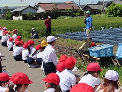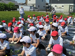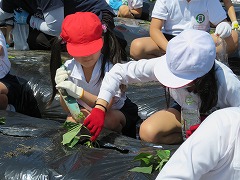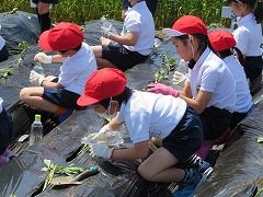 子どもたちは、ここで一人2本ずつサツマイモの蔓(つる)を受け取り、マルチシートの穴から地面に植えました。