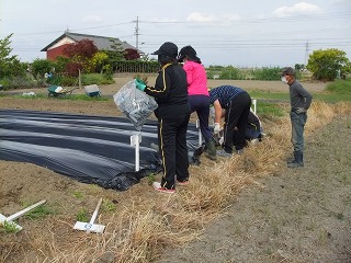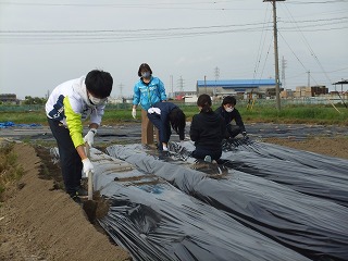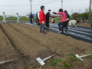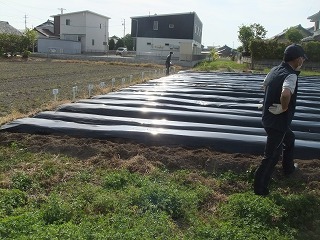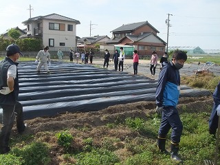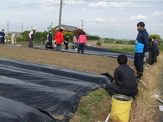 農業クラブのみなさんが作ってくださったうねに、われわれ職員がマルチをひいたりペグでとめたりしました。