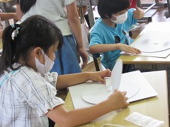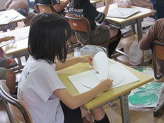 3年生が図工で工作に取り組んでいました。丸い台の上に半円の仕切りをつけ、台を回転させることで2つの場面を転換させることができる作品です。