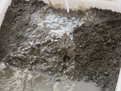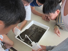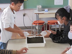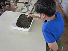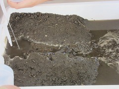 5年生が理科で流れる水野はたらきの実験をしていました。花壇の土を持ってきてバットに斜面を作り、上から水を流します。すると、最初は水たまりができますが、そのうちに一部からあふれて斜面に流れ出します。