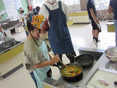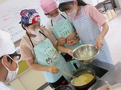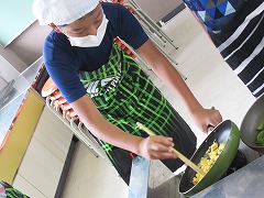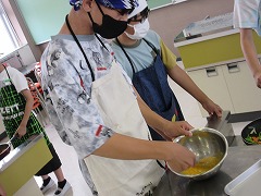 分担して野菜を切り、堅くて火の通りにくい野菜から順に炒めていきます。また、卵に牛乳や調味料を入れて混ぜ、フライパンで混ぜながら炒めます。