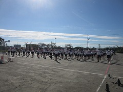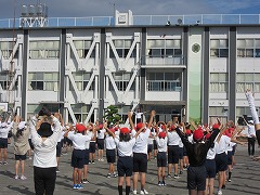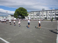 スポーツフェスティバルに向けて、全校練習を行いました。運動場には前日までの雨が少し残っていましたが、空には