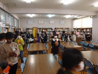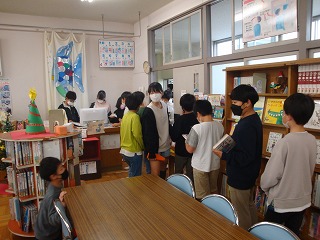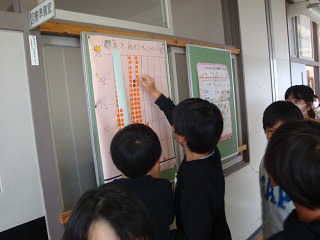 図書委員会では、昼放課に「本をたくさん読もうキャンペーン」を行っています。本を借りた3~6年生にシールを1枚ずつ渡します。そのシールを図書館廊下にある集計表に貼ります。そのシールをクラス毎に集計して、上位3クラスに表彰状を渡す、というものです。