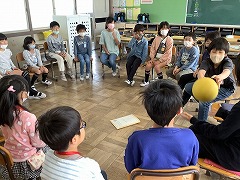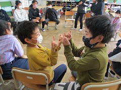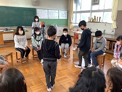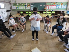「すこやか班」という縦割りの班を作っています。このすこやか班ごとに集まって、新しい1年生と一緒に自己紹介をしたり「ばくだんゲーム」をして遊んだり、記念の写真を撮ったりしました。