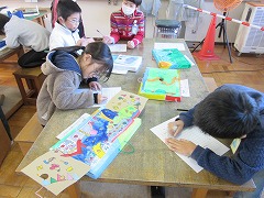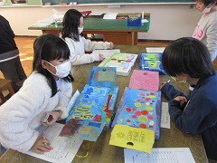 それぞれの作品の所に、見た人の感想を書く紙が用意してあるので、友達の作品を自由に見て、自分の感想を書き込んでいきます。黙々と書く子もいれば、友達と一緒に話しながら書いている子もいます。みんな真剣に考えることで、次の作品作りにも生かされていくでしょう。