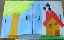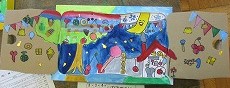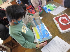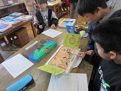 3年生が図工で作った作品について、お互いに観察し、感想を伝え合っていました。今回の作品は、窓を開くとその中に広がる不思議な世界を作りました。