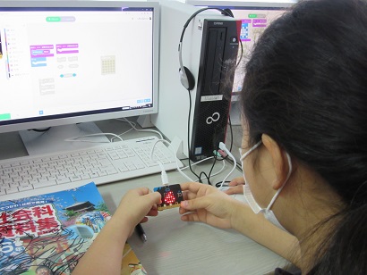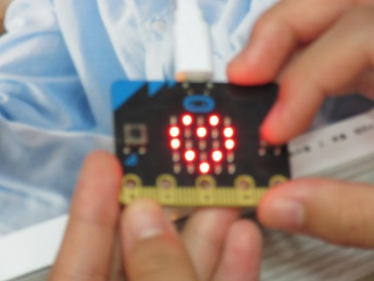 下のは、6年理科「電気と私たちのくらし」です。マイクロビットに信号を送って自分のプログラムしたように光らせる授業です。電光掲示板と同じです。でも、それを自分の思うように動かすことができるわけです。