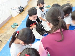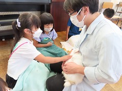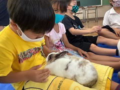 「ふれあいきょうしつ」という事業で、動物とふれあい、生き物との接し方を学ぶ機会をつくろうという趣旨で、愛知県の獣医師会からウサギを連れて獣医さんが本校に来てくれました。
