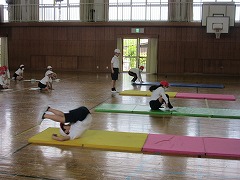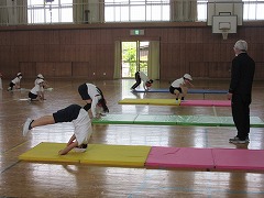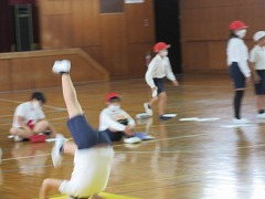 5年生が体育でマット運動に取り組んでいました。前転にもいろいろあります。通常の前転のほかに開脚(かいきゃく)前転や伸膝(しんしつ)前転ですが、特に伸膝前転は普通の小中高生大学生大人すべてを含めてもできる人はほとんどいません。機械体操の選手など特別な練習をしている人でないとできないほどのとても難しい前転です。