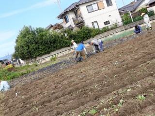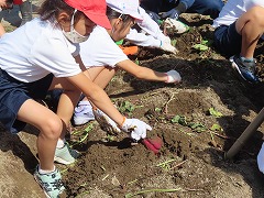 前日や当日朝に、農業体験クラブ委員のみなさんや教職員が、長く伸びた蔓を切って畑の隅にまとめ、マルチシートを剥がして、子どもたちがいもほりをしやすい状態にしてくださいました。サツマイモの蔓は伸びた先にも新しい根をはるので、成長すればするほど切るのも剥がすのも大変です。農業体験クラブ委員のみなさんありがとうございました。