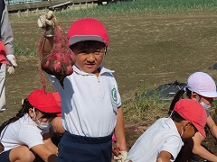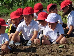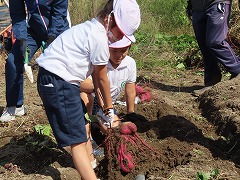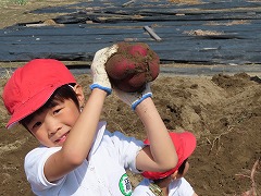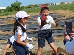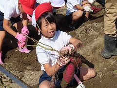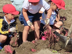 1年生のいもほりの様子。イモの様子に興味津々です。根元の太い蔓を引っ張って出てきたイモの大きさに驚いていました。自分の顔よりも大きなイモを掘った子もいました。