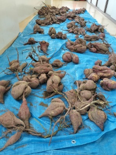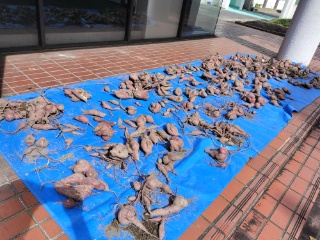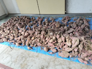 とれたイモは一次的にブルーシートに広げて乾かし、後から各学年で分けて持ち帰ります。