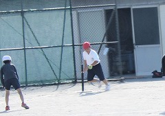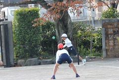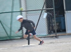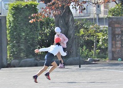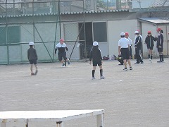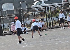 4年生が体育で、ハンドベースボールとティーボールを合わせたハンドティーボールとでもいうべき競技に取り組んでいました。
