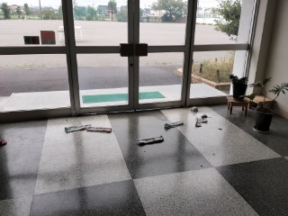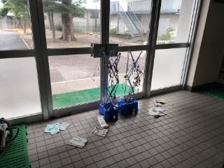 正則小では、飛ばされそうな小物類は屋内に移動してあったので大きな被害はありませんでした。来賓玄関や児童の昇降口の下から雨が侵入しないように押さえてあった雑巾が強い風の影響で内側に飛ばされていたくらいで済みました。