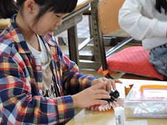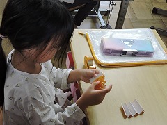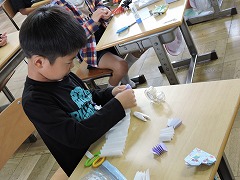 1年生が空き時間に折り紙を楽しんでいました。例えば紙をジグザグに折って片方の端を止めて扇子のように使ったり、丸く広げて飾りのように作ったりと、いろいろ工夫していました。