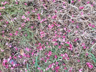 また、新しい花と入れ替わって古い花が紅いまま散るので、木の下には、沢山の花びらが落ちています。