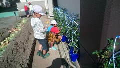 どの子も一生懸命です。朝顔のために何かをする。プチトマトのために何かをする。そんな目的意識をもった行動が、さらに深まることを期待しています。