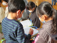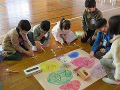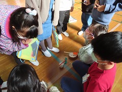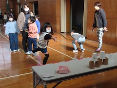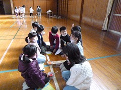2年生は、自分たちが考えた遊びを遊び方からルール、用具作りまで全部自分たちで考えて決めていきます。同じグループの子の中で話し合い、招待した1年生の子に遊び方やルールを説明します。家では見せないたくましさが見れるのではないでしょうか。