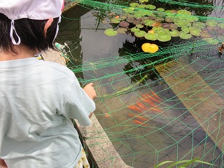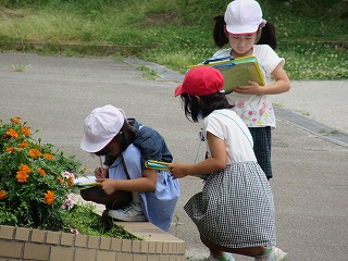 2年生が生活科で行程の自然を観察していました。いろいろな植物や昆虫、池の魚など、自分が興味を持ったものについて、大きさや形、色、できるものには手ざわりや匂い、声などを観察してワークシートにメモしていました。