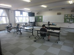 下の写真は、水泳の指導の時間に見学をする子たちが、視聴覚室で自習をしているところです。泳いでいる子と違ってプールサイドはコンクリートからの輻射熱もあり、熱中症の危険性が高まりますので、別室を用意して自習をする時間にしています。(※ 気温が低い等、熱中症の危険性が低いときは水泳指導の様子を見学しています。)