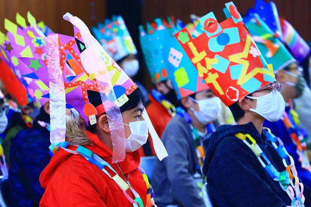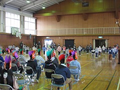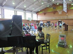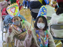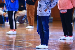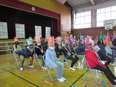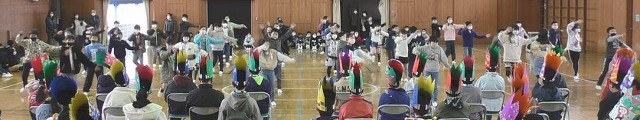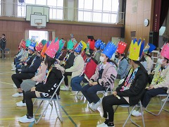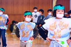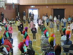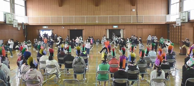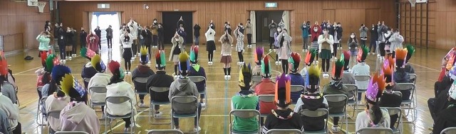 今回は、6年と5年がずっと体育館にいて、1~4年は出し物をするときだけ体育館に入るという形で行いました。これなら、体育館の人数は、全校児童の約半分です。隙間を空けるスペースが確保できます。