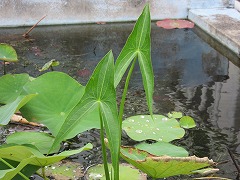 蓮の葉とは違う向きで、槍(やり)のようにとがっている葉が見えるでしょうか。
