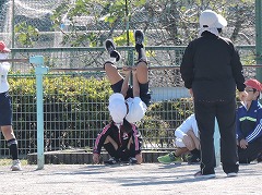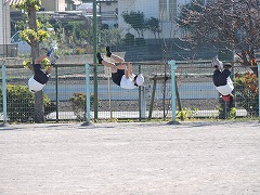 足をかけて鉄棒に逆さまにぶら下がり、そのまま手を持ち替えて体をひねるようにくるっと鉄棒の下で回ります。手を持ち替えるとき、片方の手で支えなければなりません(足をかけても手を持ち替えることもできます)。でも、体のどの部分で支えているか理解していないと、手を離すこと自体が怖くなってしまう事もあります。自分の重心がどこにあるか、体が自然に理解している子もいますが、通常は毎日のさまざまな動きの中から覚えていきます。