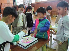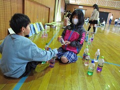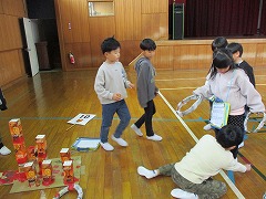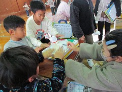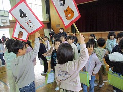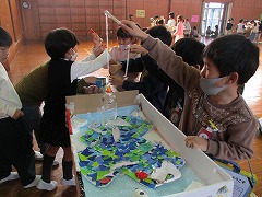 2年生が1年生を招いて、生活科で作ってきたおもちゃを使って「おもちゃフェスティバル」を開きました。まずは全体でやり方を説明します。