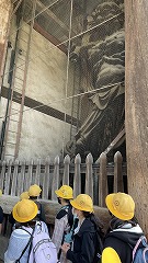 南大門の両側に立っている運慶と快慶が作った有名な金剛力士像です。大きいですね。昨日の清水寺の仁王門の仁王像とは、まずこの大きさが違います。た、門自体が作られた時期も違います。仁王門は朱色が鮮やかで新しそうでしたね。これらの違いを学校に帰ったら調べてみましょう。
